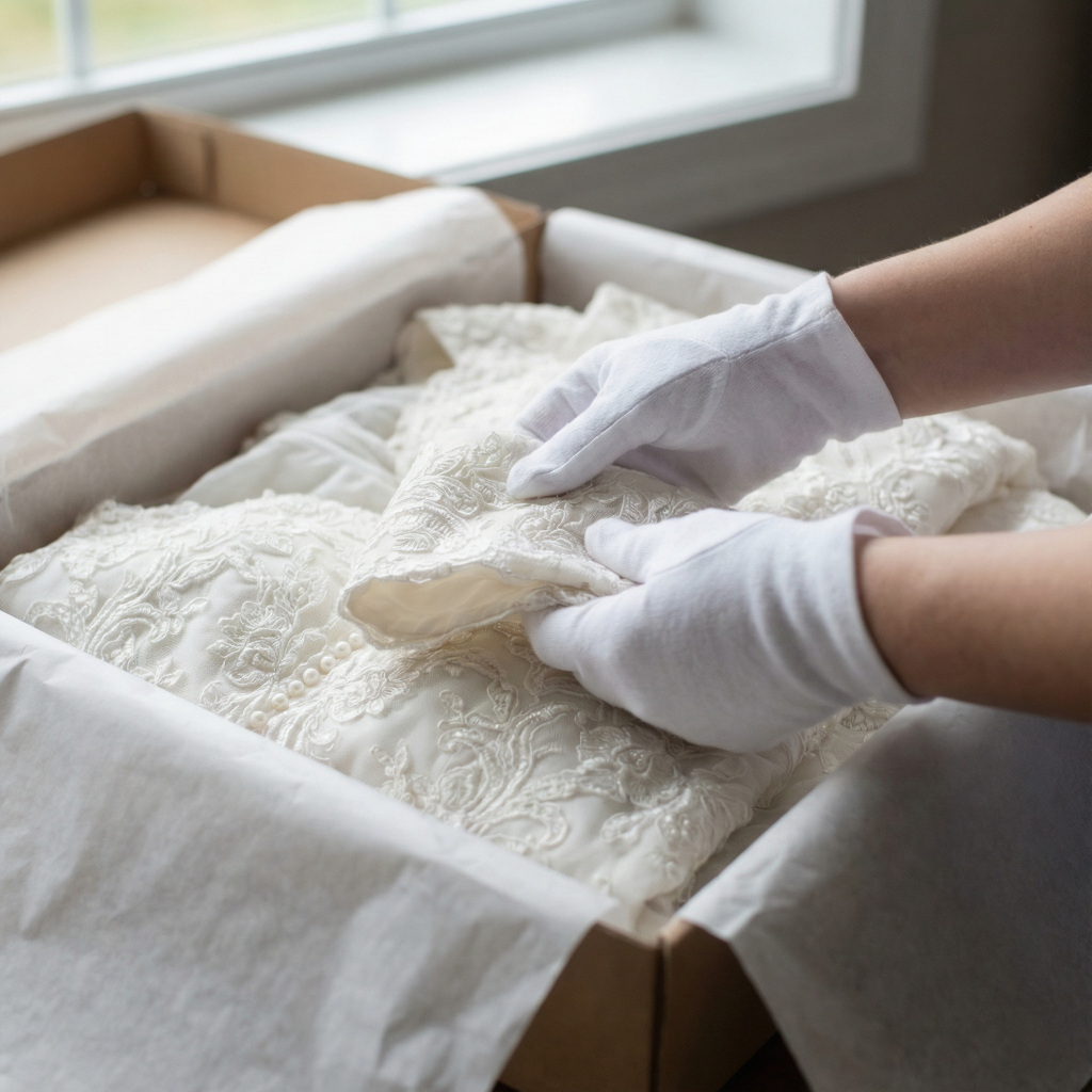 Our experts meticulously inspect every inch of the hemline, bodice, and train. Once cleaned and hand-finished, your gown is carefully packaged in a museum-quality, acid-free preservation chest. This sealed environment protects the fabric from light, dust, moisture, and insects, ensuring it remains as beautiful as the day you wore it.